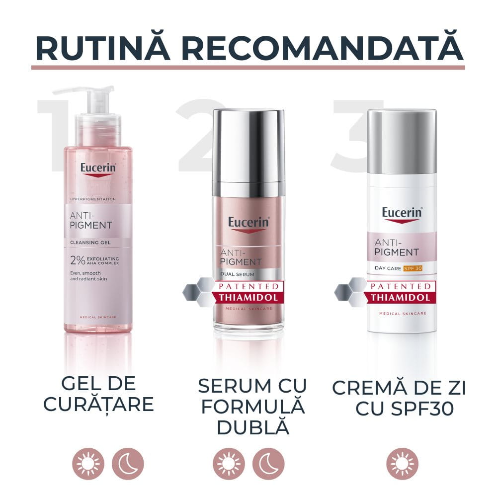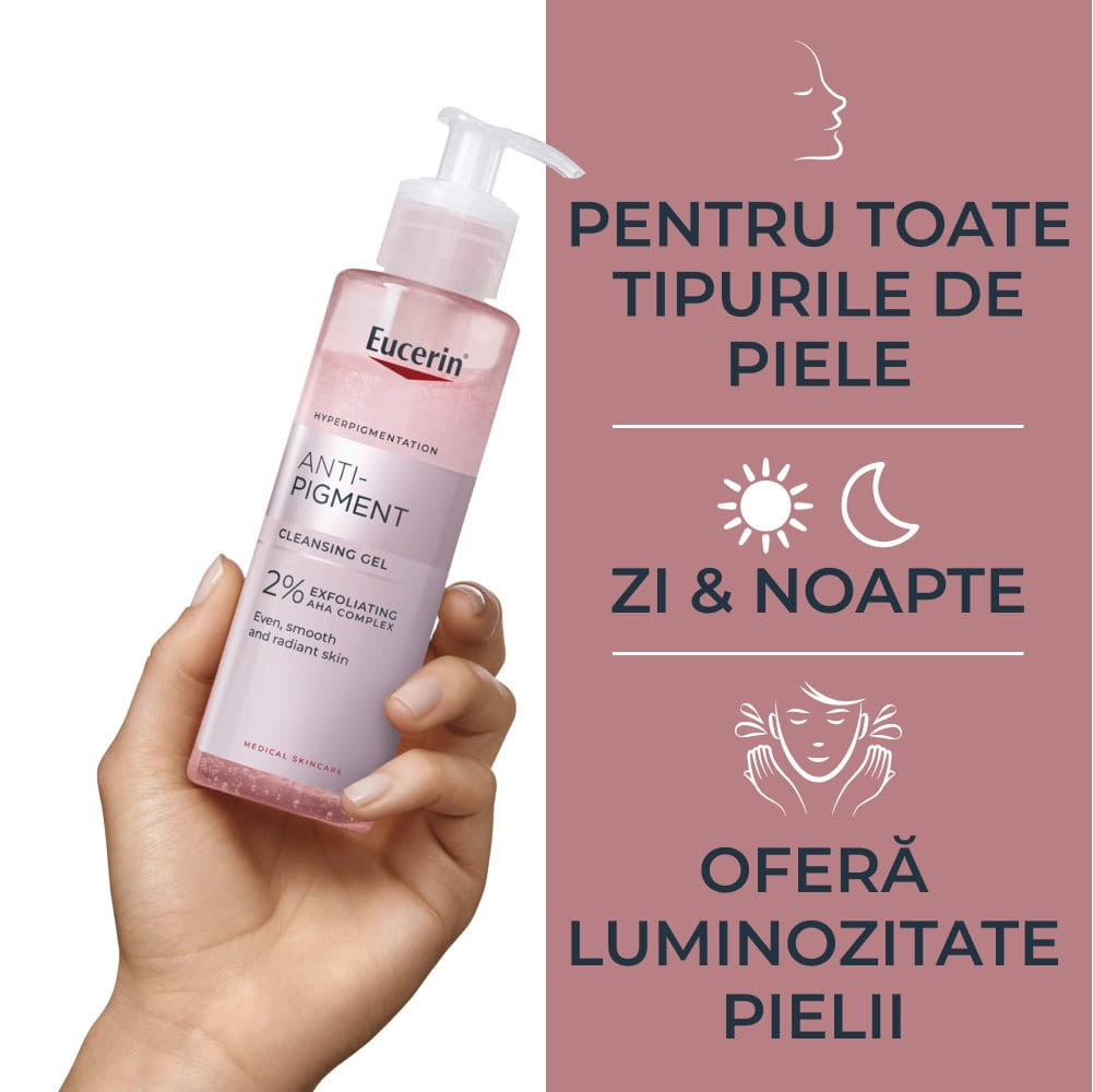 Gelul de curățare exfoliant Anti-Pigment conține 2% AHA (Acizi Alfa-Hidroxi), folosit în principal pentru a exfolia pielea. Exfolierea este un proces prin care celulele moarte de la suprafața pielii sunt eliminate. Prin îndepărtarea celulelor moarte, se stimulează regenerarea pielii. Glucozida de Glicerină și Glicerina sunt umectanți care ajută la optimizarea distribuției umidității în piele. Pentru prima dată, Eucerin® oferă un gel de curățare care pregătește pielea pentru a absorbi optim produsele Anti-Pigment. Aceasta permite ca proprietățile hrănitoare să acționeze cel mai eficient pentru un început de zi încrezător.
