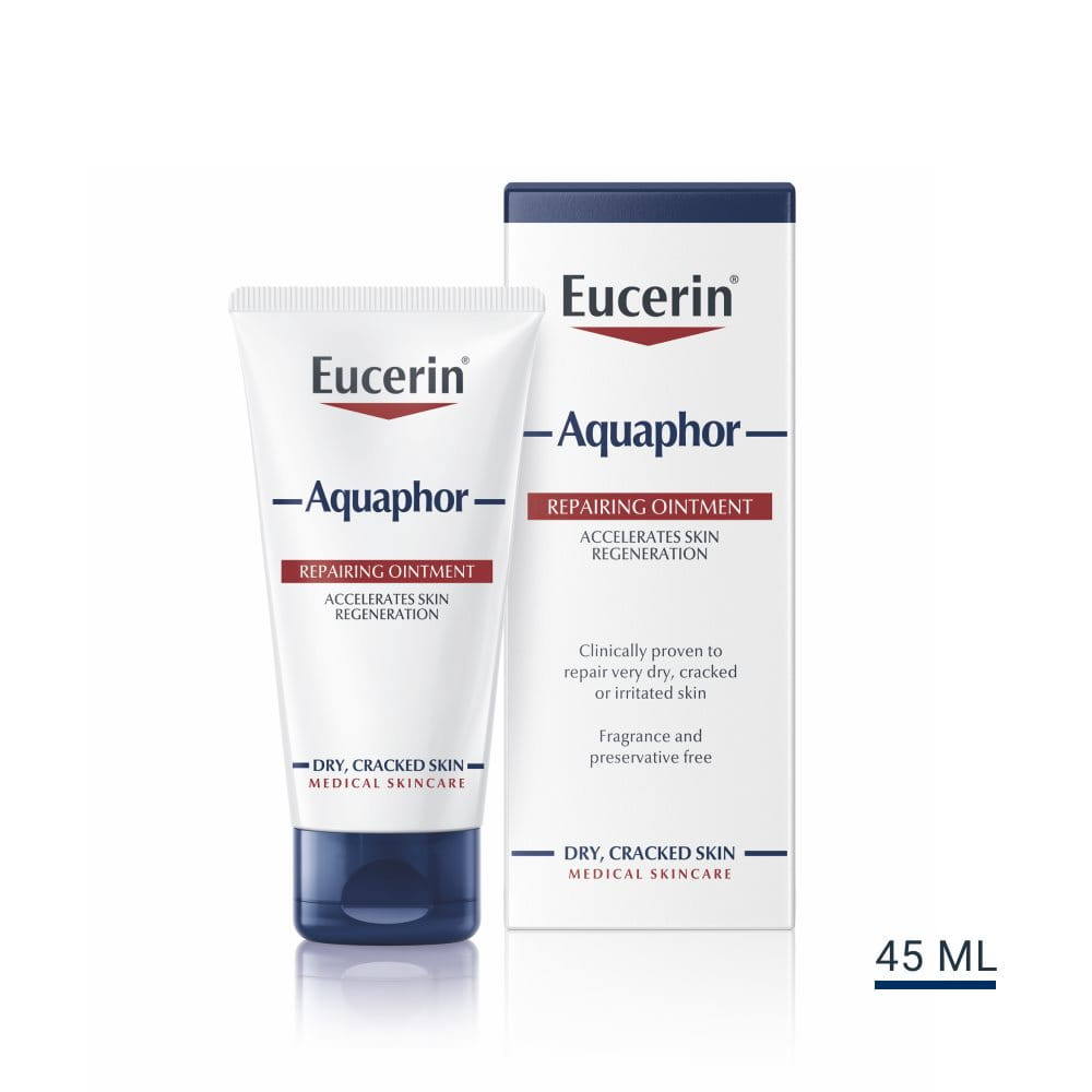 Unguentul reparator pentru corp Eucerin® Aquaphor este conceput pentru îngrijirea SOS a pielii foarte uscată și crăpată. Îmbogățit cu Glicerina care atrage apa și ajută la menținerea acesteia în piele, alături de Pantenol, care accelerează regenerarea și repararea, hidratând pielea în același timp. Fără parfum și fără conservanți, dovedit clinic și dermatologic. Are efect calmant și o textură transparentă, fiind ușor de aplicat - masează ușor zonele cu probleme ale pielii, cum ar fi genunchii și coatele, articulațiile, cuticulele și călcâiele crăpate. Este bine tolerat de pielea sensibilă și potrivit pentru utilizare la îngrijirea pielii bebelușilor și a copiilor, precum și la arsuri minore după proceduri dermatologice superficiale, cum ar fi tratamentele cu laser și peelingurile chimice<sup>1</sup>. Pielea este vizibil regenerată, protejată și reparată.