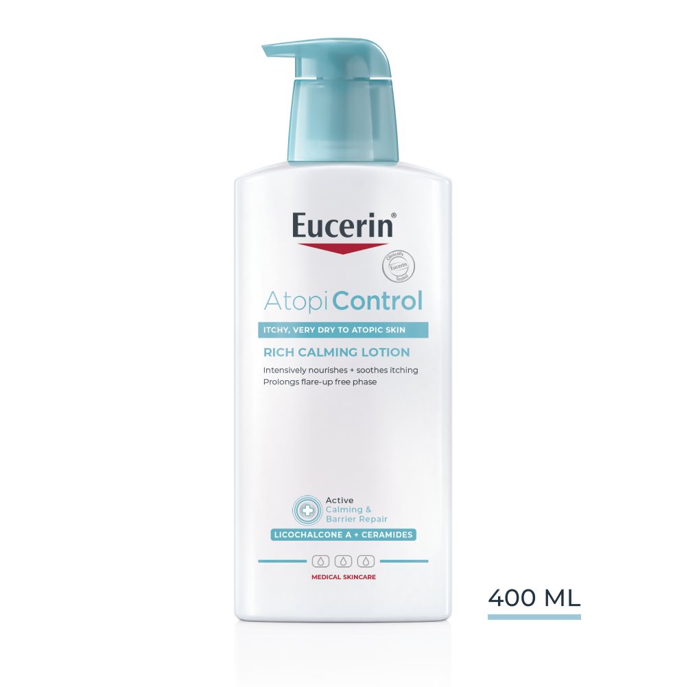 Loțiunea calmantă de corp Eucerin® AtopiControl este o loțiune pentru eczeme, creată pentru utilizare zilnică, care calmează și hidratează intens pielea iritată și cu mâncărimi. Formula sa apă-în-ulei, ușor de absorbit, este îmbogățită cu ingrediente calmante precum Licocalcona A, Ceramide și Omega, care întăresc bariera pielii, ameliorează uscăciunea, mâncărimea și contribuie la prelungirea perioadelor fără episoade acute de dermatită atopică.