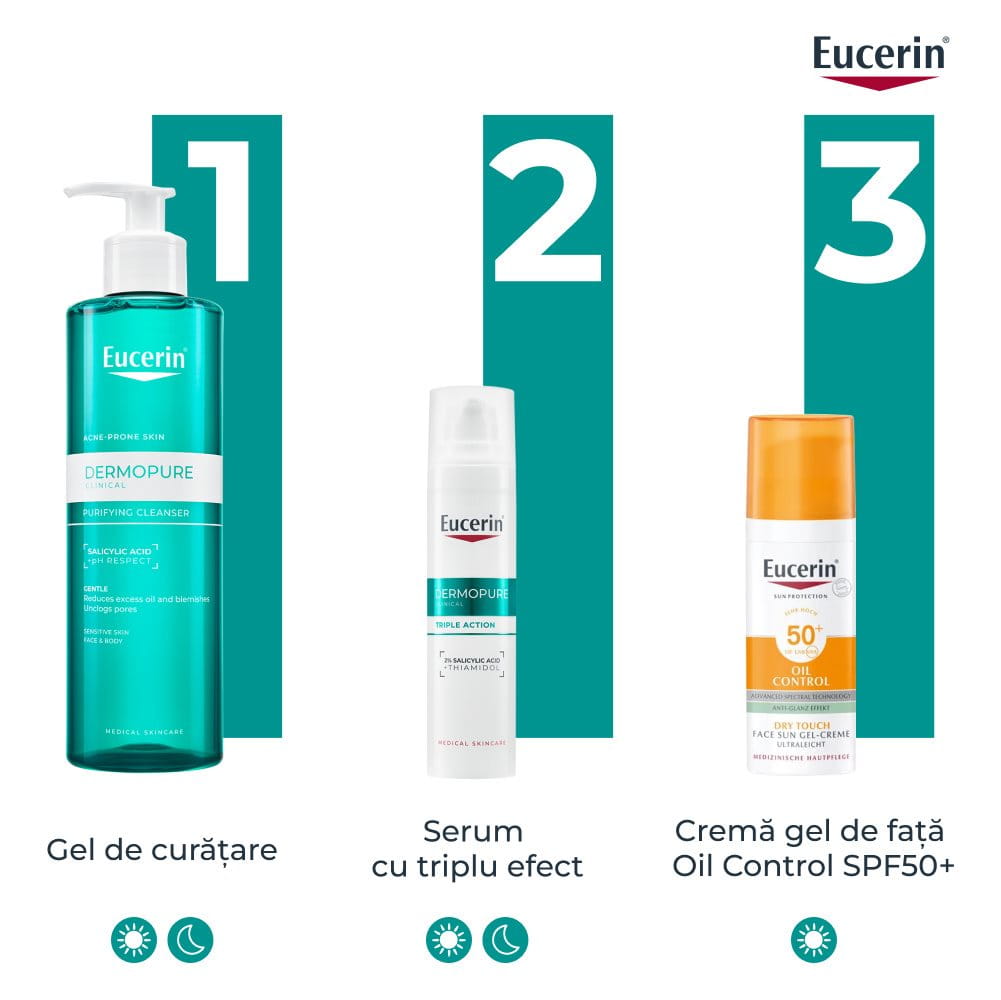 ⦁ Pasul 1: CURĂȚARE cu Gel de curățare DERMOPURE ⦁ Pasul 2: TRATEAZĂ cu Serumul DERMOPURE cu triplu efect ⦁ Pasul 3: PROTEJEAZĂ cu Crema-gel de față DERMOPURE Oil Control