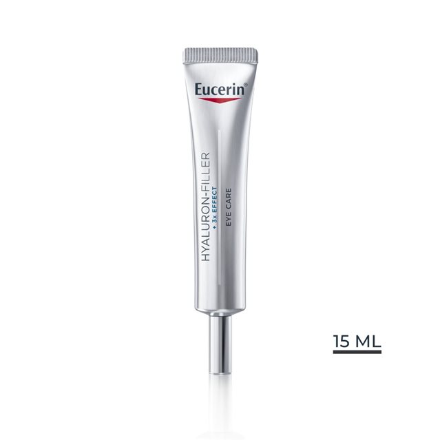 Crema de ochi Eucerin Hyaluron-Filler +3x Effect cu SPF 15 reduce vizibil liniile fine și ridurile. Formula sa cu 3x EFFECT acționează în trei moduri: umple ridurile cu ajutorul Acidului Hialuronic cu greutate moleculară mare și mică, stimulează producția naturală de Acid Hialuronic cu ajutorul Glicinei Saponine și ajută la protejarea împotriva îmbătrânirii premature. Formula fără parfum se absoarbe rapid și este testată oftalmologic, fiind ideală pentru utilizarea zilnică, chiar și sub machiaj.