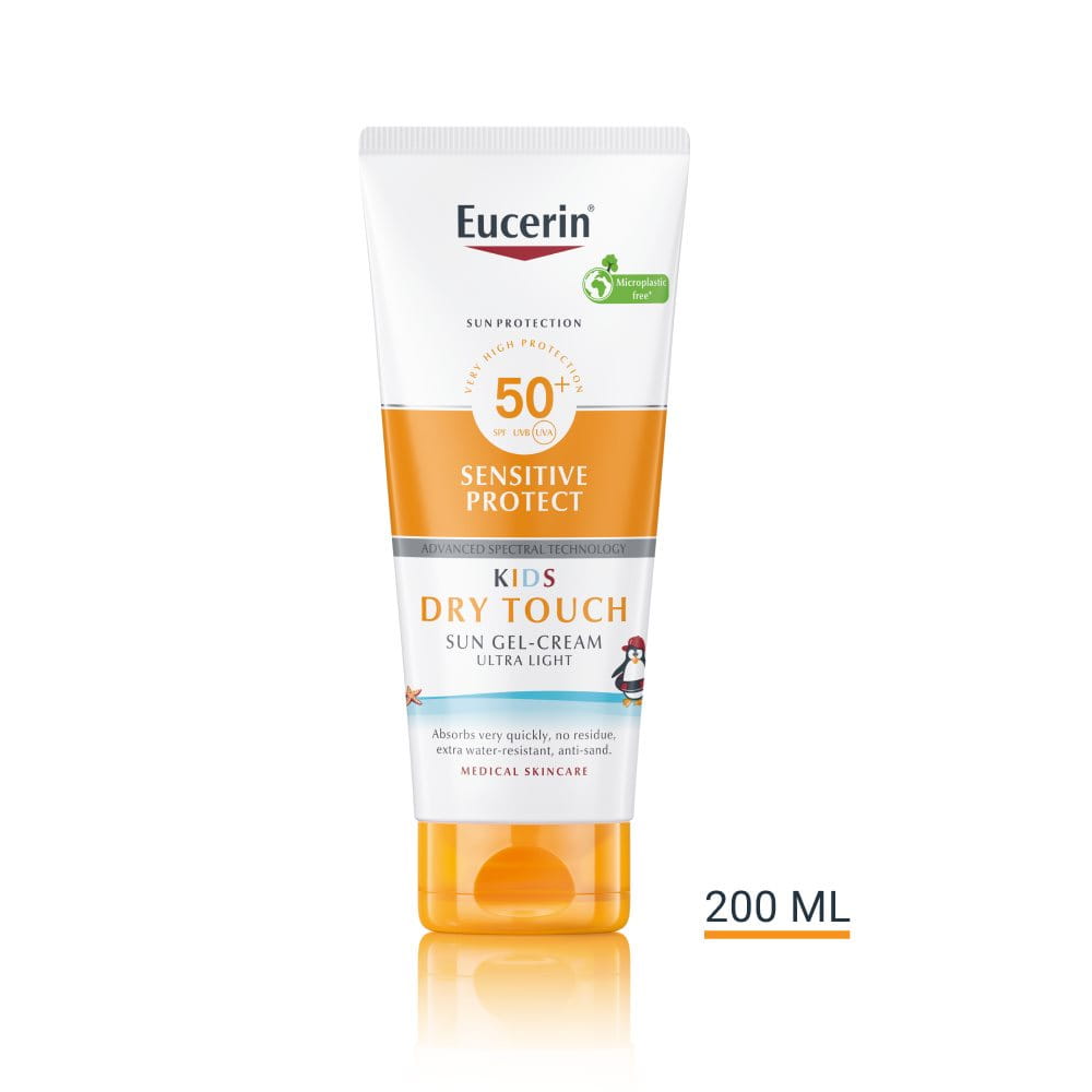 Loțiunea de corp Eucerin Sun Dry Touch cu SPF50+ ultra ușoară este o loțiune cu protecție solară pentru bebeluși și copii care calmează pielea tânără sensibilă și o protejează de arsurile solare și daunele provocate de soare pe termen lung. Tehnologie Spectrală Avansată de la Eucerin® combină filtrele UVA și UVB de bandă largă și fotostabile1 pentru o protecție UV foarte ridicată cu Licocalcona A pentru a neutraliza radicalii liberi cauzați de lumina UV și HEVIS. Loțiunea include, de asemenea, Acid Gliciretinic, care susține mecanismul de reparare a ADN-ului pielii. Fără parfum și foarte rezistentă la apă, include și tehnologia "Anti-Pete după spălare" de la Eucerin®. Loțiunea Dry Touch SPF50+ are toleranță foarte ridicată pe pielea sensibilă a copiilor, chiar și pe pielea predispusă la atopie, dovedită clinic și dermatologic.
