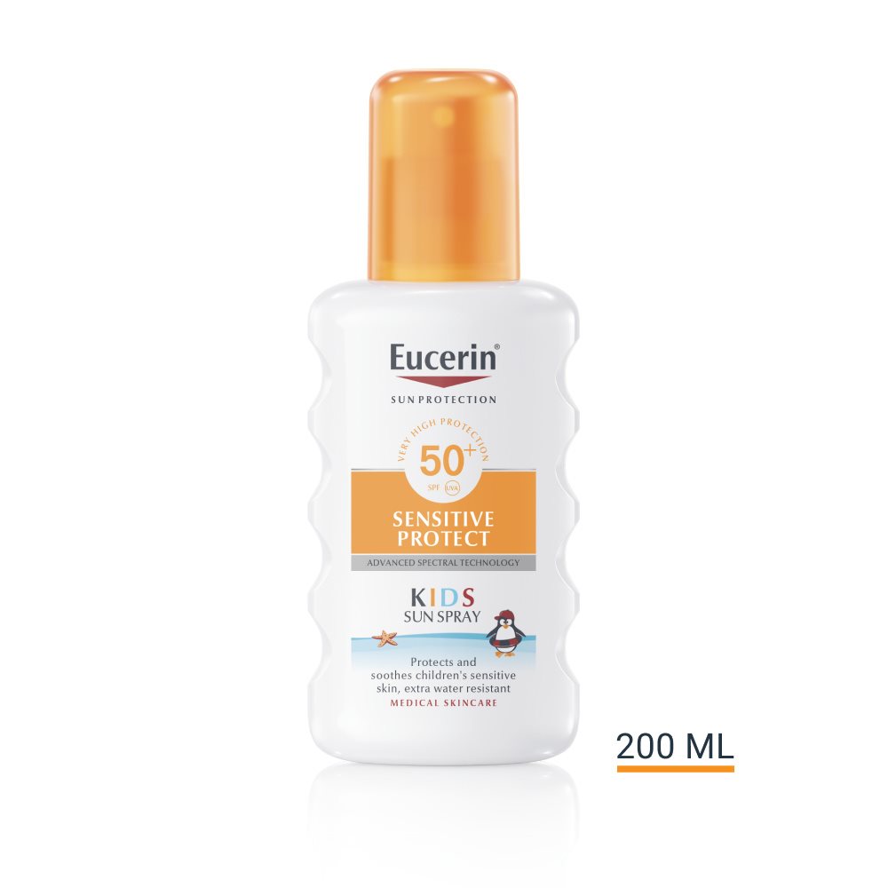 Lumina UV este principala cauză a arsurilor solare, dar lumina vizibilă cu energie înaltă (HEVIS) poate declanșa, de asemenea, radicalii liberi care provoacă stres suplimentar asupra pielii. Spray de corp Eucerin® SPF50+ este un spray cu factor de protecție solară pentru copii special formulat pentru a calma pielea sensibilă și a o proteja de daunele produse de expunerea la soare pe termen lung. Potrivit pentru pielea atopică. Tehnologie Spectrală Avansată combină filtrele UVA și UVB de bandă largă și fotostabile1 pentru o protecție UV foarte ridicată, cu Licocalcona A pentru a neutraliza radicalii liberi cauzați de lumina UV și HEVIS. Spray-ul include, de asemenea, Acid Gliciretinic care susține mecanismul natural de reparare a ADN-ului pielii. Acest produs este fără parfum și este foarte rezistent la apă. S-a dovedit clinic și dermatologic că Spray de corp Eucerin® SPF50+ este potrivit pentru pielea sensibilă a copiilor, inclusiv pentru pielea cu dermatită atopică. Potrivit pentru bebeluși de la 3 luni