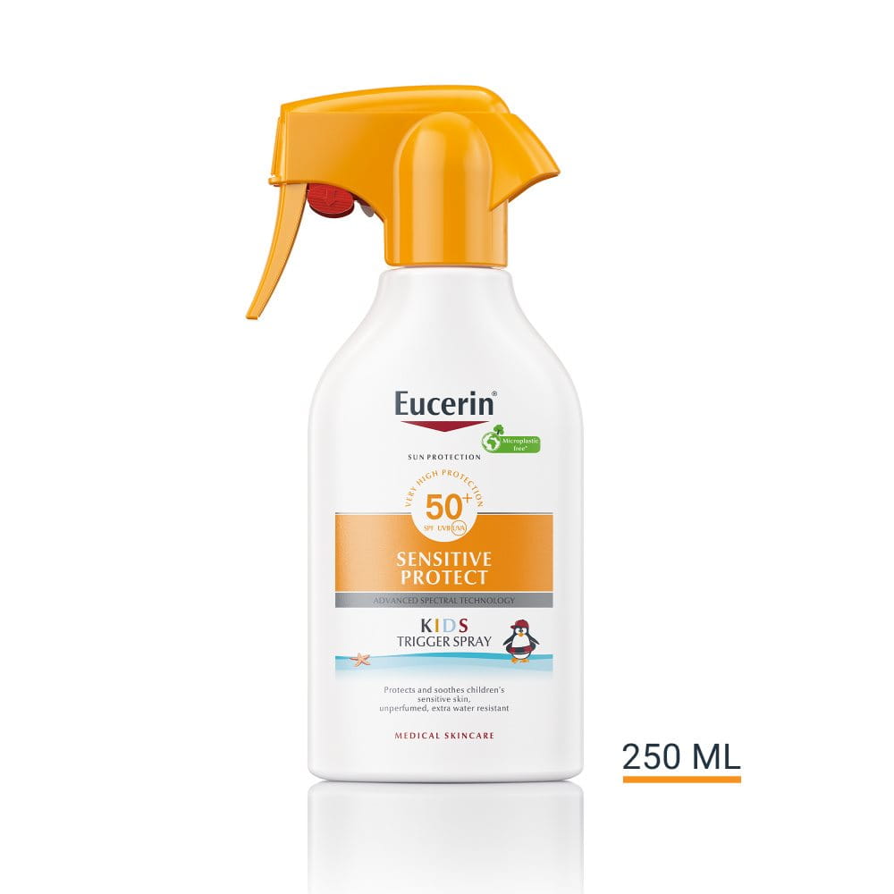 Spray-trigger-ul Eucerin® Sun cu SPF50+ pentru copii este special formulat pentru a calma pielea sensibilă și a o proteja de arsurile solare și daunele provocate de soare pe termen lung. De asemenea, este potrivit pentru pielea atopică. Tehnologie Spectrală Avansată combină filtrele UVA/UVB de bandă largă și fotostabile1 pentru o protecție UV foarte ridicată cu Licocalcona A pentru a neutraliza radicalii liberi cauzați de lumina UV și HEVIS. Formula include, de asemenea, Acid Gliciretinic, care susține mecanismul natural de reparare a ADN-ului pielii. În plus, este fără parfum și ultra rezistentă la apă. Produsul are toleranță foarte ridicată pe pielea sensibilă a copiilor, chiar și pe pielea predispusă la atopie, dovedite clinic și dermatologic.